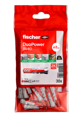 La cheville DUOPOWER est l'alliance de deux matières offrant ainsi de multiples modes de fonctionnement. Cheville bimatière pour de meilleures performances et un fonctionnement ingénieux (s'expanse, se déploie, forme un noeud), en fonction du support. Excellent 'feel-good factor'. On sent précisément quand la cheville est correctement posée. La cheville est plus courte, ce qui assure une fixation rapide sans longs travaux de perçage. La collerette étroite évite le glissement de la cheville dans le forage. Les ergots anti-rotation empêchent la cheville de tourner dans le trou lors de l'installation.
