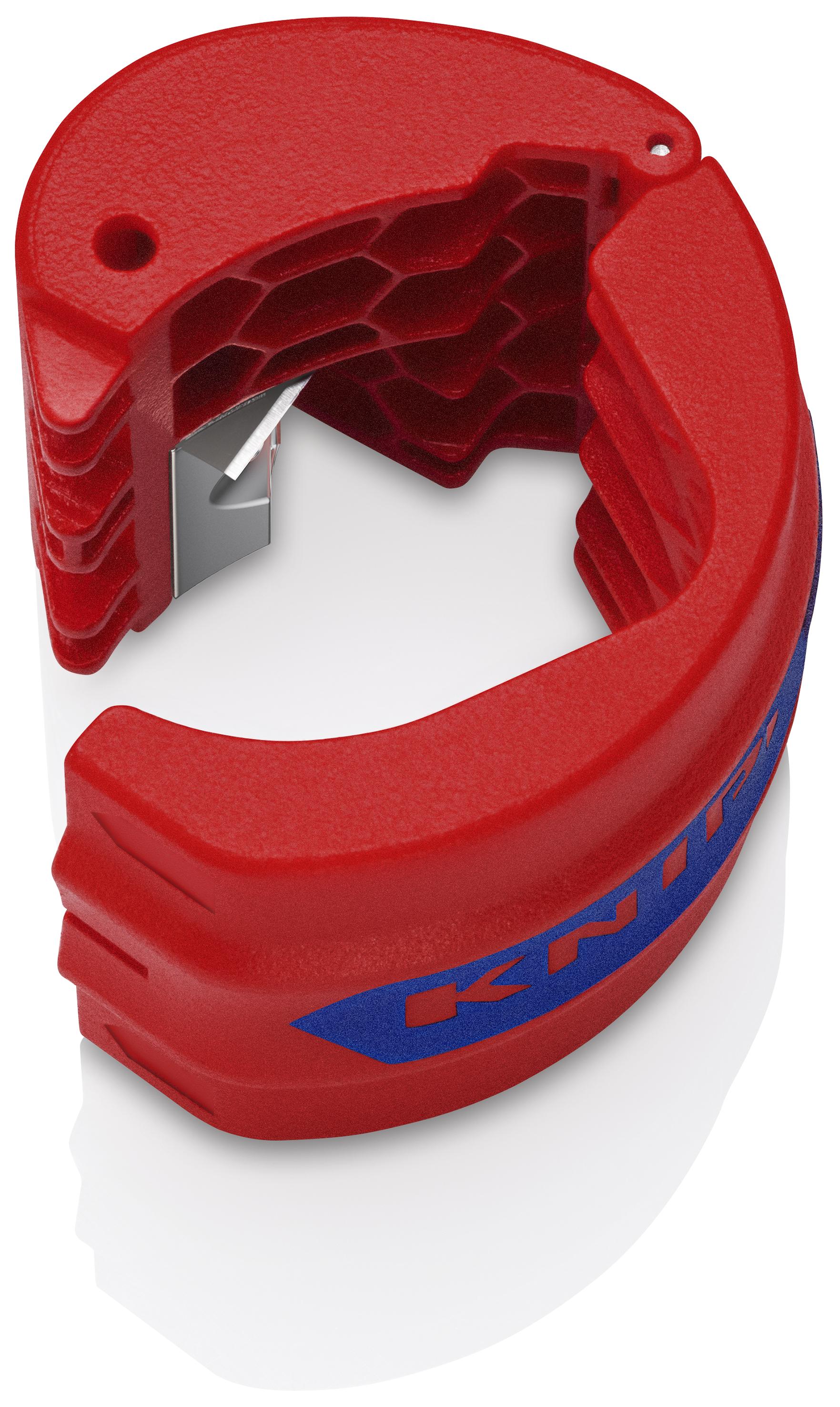 Coupe-tube intelligent : coupe les tubes sans copeau et tient confortablement dans la main. Peut couper les tuyaux d’écoulement en plastique à haute température et les conduits électriques en un rien de temps. Peut être utilisé pour couper les manchons d’étanchéité pendant l’assemblage final – près des parois, conforme aux normes. Coupe les tubes en plastique non renforcé de Ø 20 à 50 mm avec une épaisseur de paroi jusqu’à 2,4 mm. Coupe les tubes en plastique (PVC, PVC-U, PE, IRL …) et les tubes PVC avec âme en mousse de Ø 20 à 50 mm avec une épaisseur de paroi jusqu'à 3,5 mm. Coupe les manchons d’étanchéité à environ 2 à 3 mm des parois. Coupe les tubes rapidement, proprement et sans copeau ni bavure. Bloc lame rotatif pour couper les tubes en plastique (lame au centre) ou les manchons d’étanchéité (lame à l’extrémité). Avec mécanisme de verrouillage pour un transport sûr. Deux lames de rechange intégrées dans l’outil. Outil en plastique renforcé stable, bloc lame en zinc moulé sous pression. Lames en acier inoxydable chirurgical spécial – Fabriquées à Solingen.