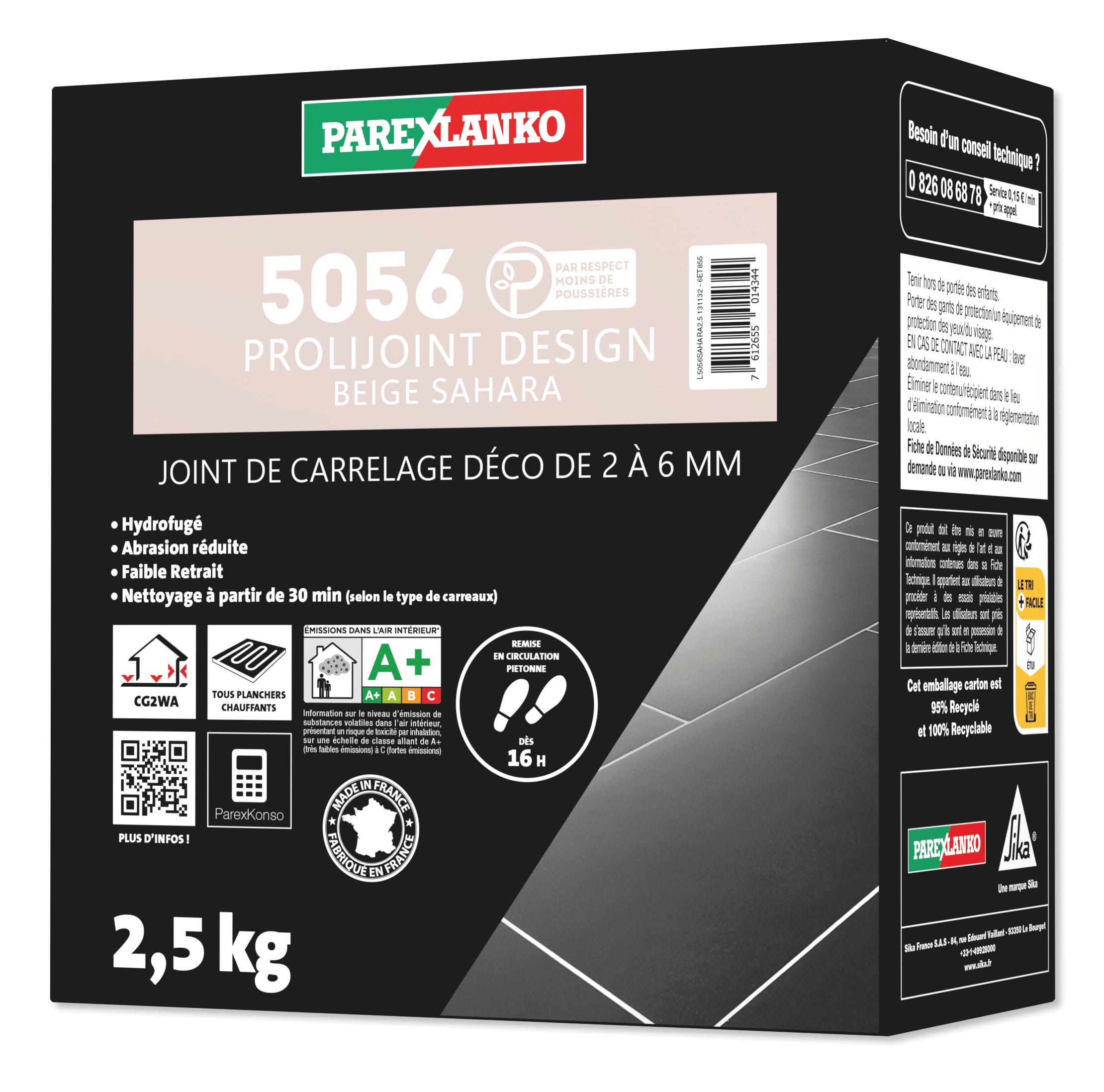 Le joint de carrelage PROLIJOINT DESIGN 5056 Beige Sahara est un mortier prêt à gâcher spécialement conçu pour le jointoiement de carreaux de 2 à 6 mm, en murs et sols intérieurs comme extérieurs. Adapté à tous types de carrelages (grès cérame, faïence, mosaïque de pâte de verre, pierres calcaires ou marbrières, granit), il offre une teinte homogène et durable grâce à ses pigments colorés de haute qualité. Sa formulation hydrofugée réduit l’absorption d’eau et garantit des joints résistants à l’usure et aux salissures.