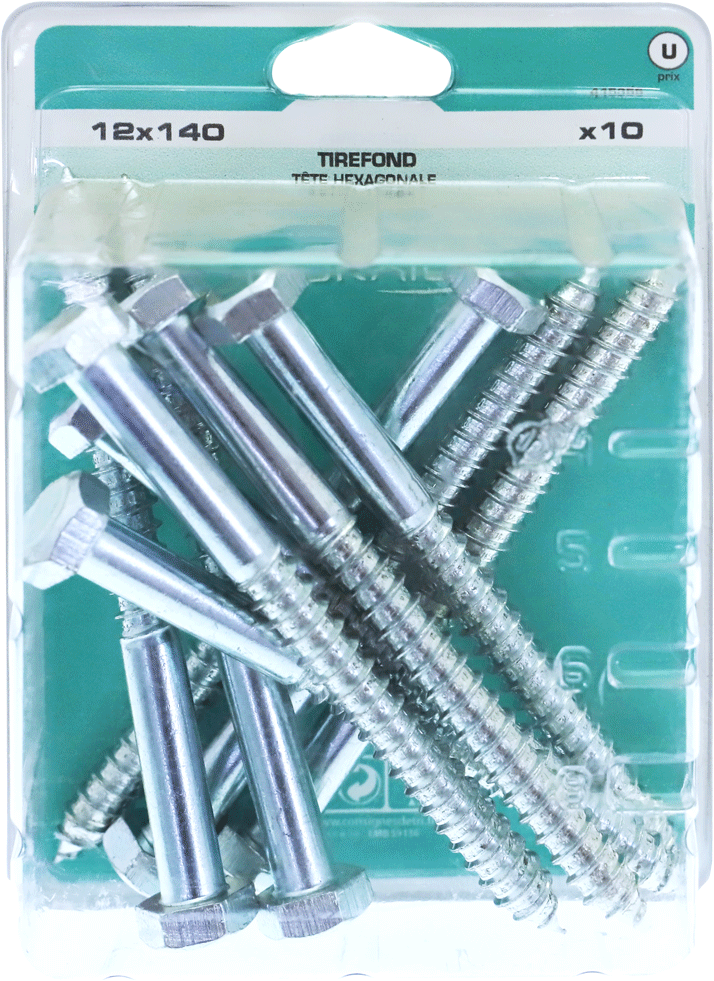 Tirefond Tête héxagonale Acier zingué 12x140 Blister de 10