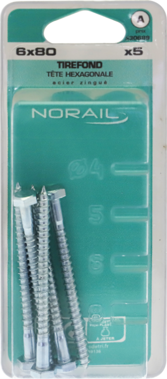 Tirefond Tête héxagonale Acier zingué 6x80 Blister de 5