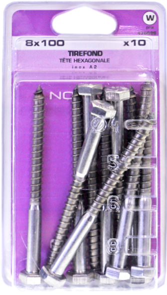 Tirefond Tête héxagonale Inox A2 8x100 Blister de 10
