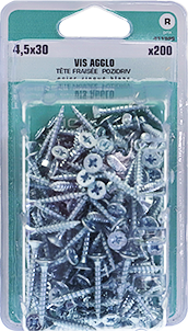 VIS AGGLO POZIDRIV TÊTE FRAISÉE 4,5X30 ACIER ZINGUE BLANC BLISTER X200